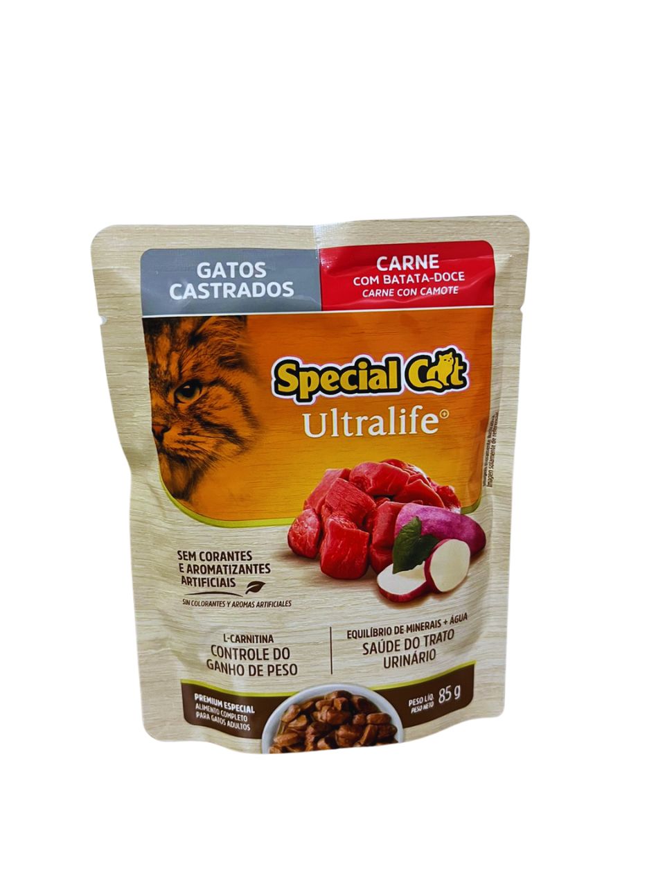 Carne de bovino, carcaça de aves, miúdos de suínos, plasma sanguíneo desidratado de suíno, hemoglobina desidratada de bovino, gelatina, farinha de batata doce, fibra de mandioca, farinha de trigo, amido modificado de milho, dextrose, proteína isolada de soja, proteína texturizada de soja, óleo de aves, biomassa de microalgas desidratada (Schizochytrium sp.), celulose, levedura de cana de açúcar hidrolisada e desidratada, extrato de Yucca schidigera, subproduto da extração da L-cistina, cloreto de sódio, carbonato de cálcio, cloreto de potássio, água, glicina, cloridrato de L-cisteína monohidratado, taurina, DL-metionina, L-carnitina, vitamina D3, vitamina E, vitamina K3, vitamina B1, vitamina B2, vitamina B6, vitamina B12, vitamina C, niacina, cloreto de colina, ácido pantotênico, ácido fólico, biotina, iodato de cálcio, minerais (glicinatos: ferro aminoácido quelato, cobre aminoácido quelato, manganês aminoácido quelato e zinco aminoácido quelato), goma guar, carragena, tripolifosfato de sódio, caramelo I.
